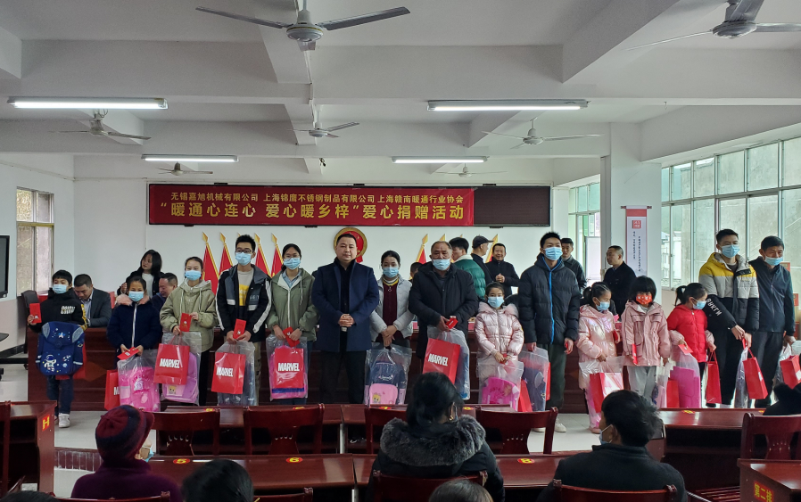 1月28日,愛心企業(yè)無錫嘉旭機(jī)械有限公司、上海錦鷹不銹鋼制品有限公司、上海贛南暖通行業(yè)協(xié)會攜手到謝坊鎮(zhèn)開展“暖通心連心 愛心暖鄉(xiāng)梓”愛心捐贈活動。為落實(shí)好疫情防控工作,會場參會人員行程碼、健康碼均為綠色,參會期間全程帶好口罩,做好個(gè)人防護(hù)工作。